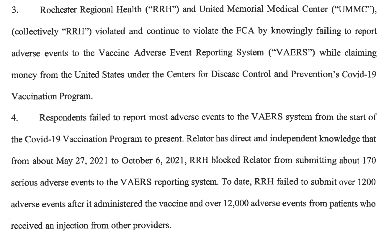 On June 11, 2025, District Court Judge John Sinatra denied the defendants' motion to dismiss the case. In rendering its decision, the court found that Rochester Regional Health "had a material obligation to report serious adverse events to VAERS" and their "failure to report while continuing to seek federal reimbursement was potential fraud against the government."